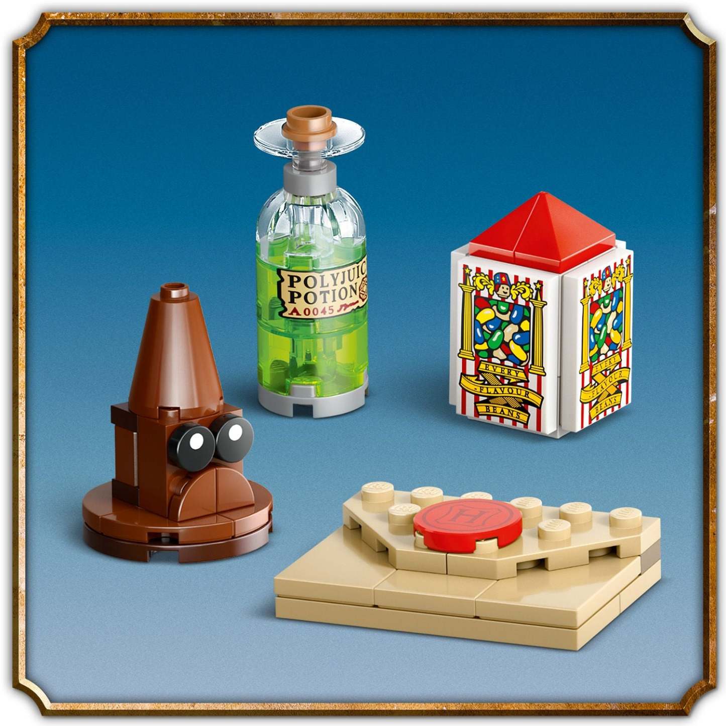 - 10 mini builds – A Hogwarts™ acceptance letter, chocolate frog, Bertie Bott’s Every-Flavour Beans™, butterbeer, the Sorting Hat™, 3 potions, The Monster Book of Monsters and 2 Galleons