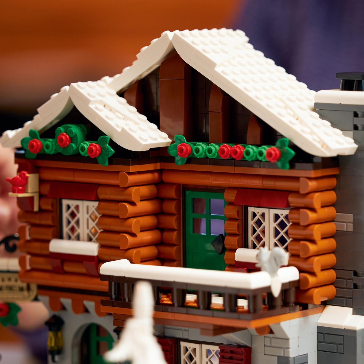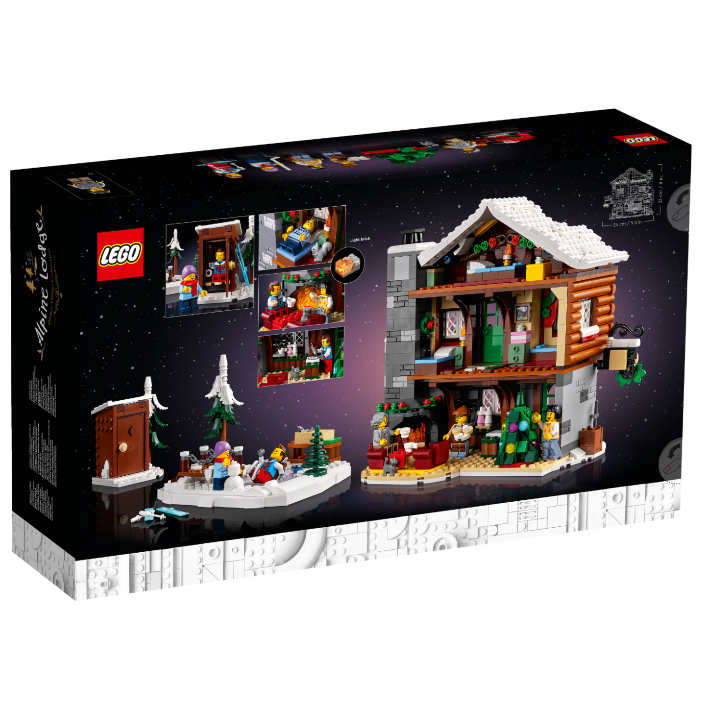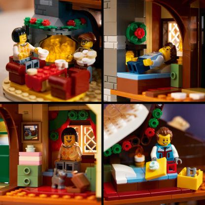 - What’s in the box? – All you need to build the 3-story alpine lodge, outdoor skating area, toilet cabin, snowmobile and trailer, plus a holiday tree, 5 minifigures and cat, squirrel and bird figures