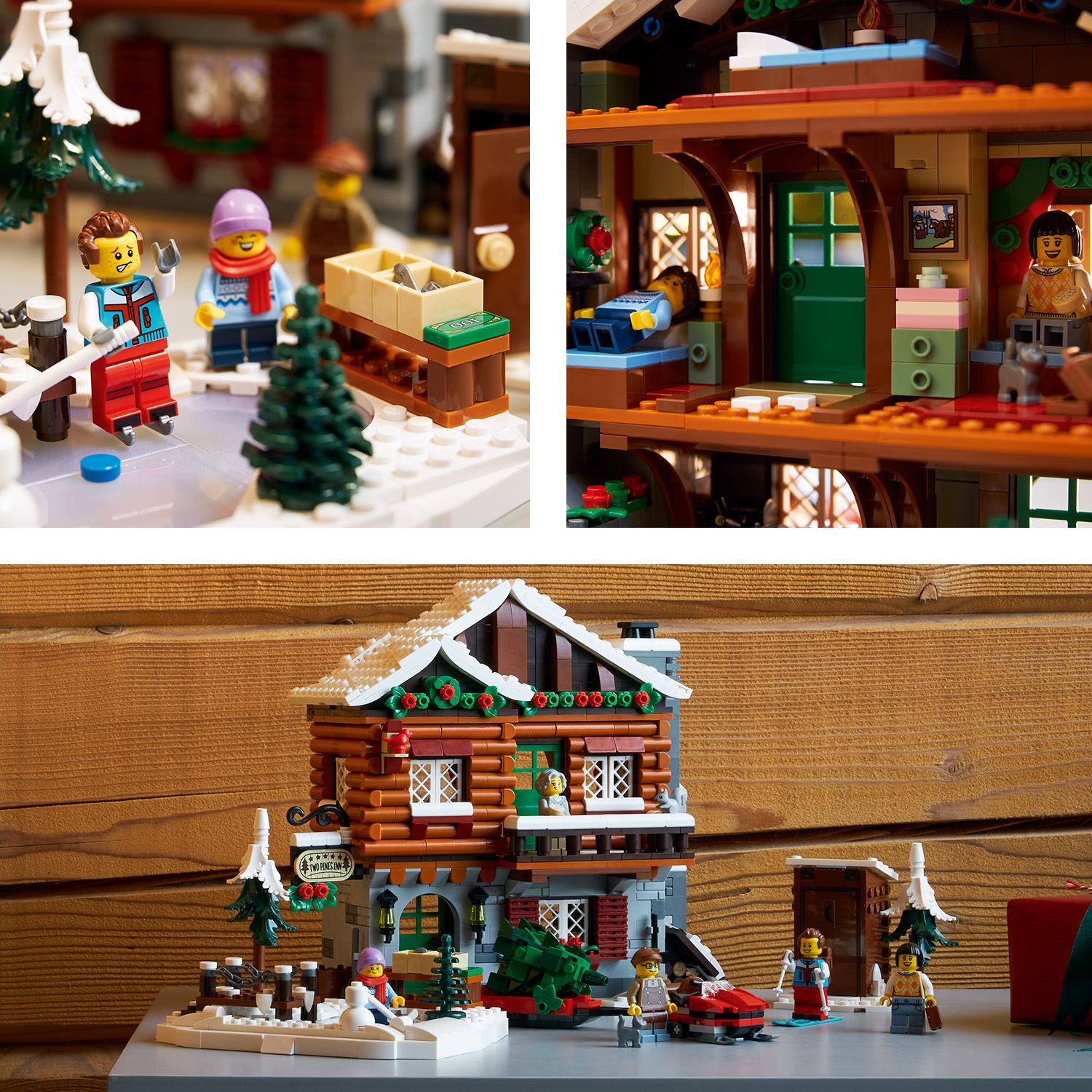The 3-level model lodge has a furnished reception room with a check-in counter, illuminating log fire and coffee machine, a second-floor guest room with an illuminating log fire and 2 beds, and a third-floor loft bedroom. Outdoor features include a wood store, ski box, skating area and a toilet cabin, plus a snowmobile, holiday tree, 5 minifigures and bird, cat and squirrel figures.