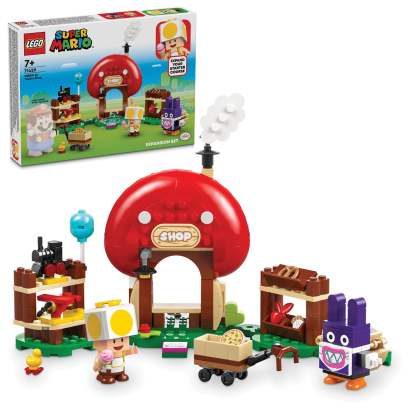 - Yellow Toad playset featuring a Nabbit toy figure – Role-play a trip to Toad’s Shop with this LEGO® Super Mario™ Expansion Set, featuring a brick-built shop and lots of fun accessories